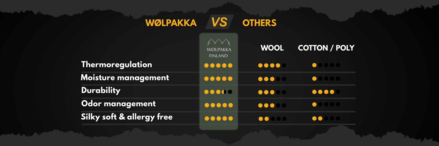 Lähes kaikissa villan ydinominaisuuksissa alpakka päihittää merinon. Jokaisessa alpakanvillakuidussa on enemmän mikroskooppisia ilmataskuja, mikä parantaa eristystä ilman lisäpainoa. Verrattuna merinoon alpakka siirtää kosteutta tehokkaammin ja imee selvästi vähemmän vettä – se kuivuu nopeammin ja pitää olosi kuivana liikkeessäkin.